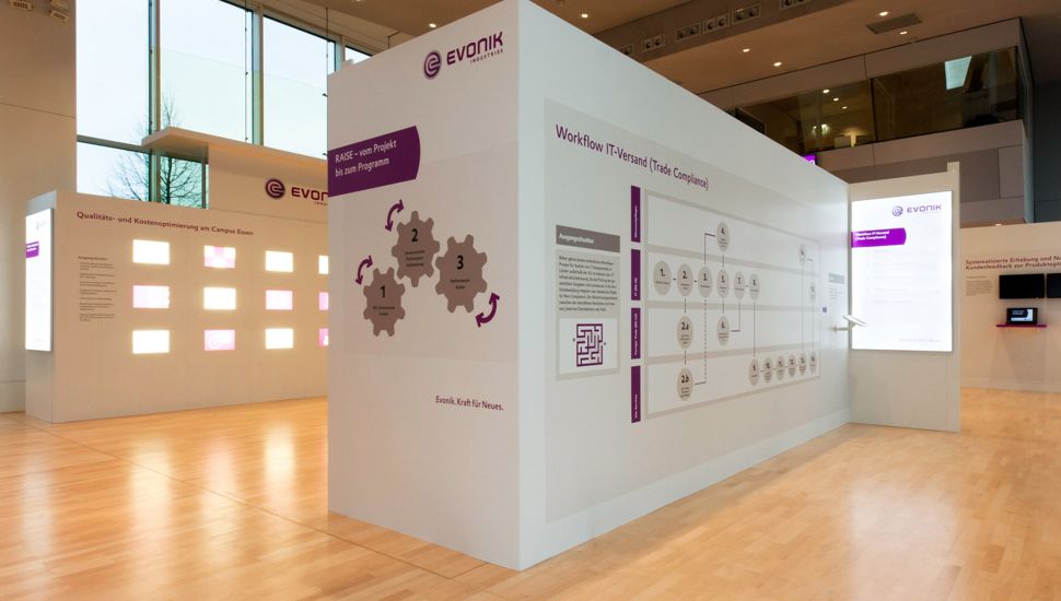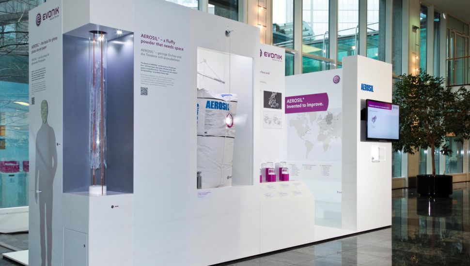 Für das Projektteam von Evonik und die Experten des verantwortlichen Oberhausener Messebau-Unternehmens AMECKO war der beste Zugang über Interaktionen schnell gefunden: Im Selbststudium erkunden die Evonik-Firmenangehörigen und Besucher der Standorte die besonderen Eigenschaften und zahlreichen Einsatzmöglichkeiten. Über Informationswände können sie dann tiefer in die Produktwelt eintauchen. Alle Inhalte werden schnell, leicht verständlich und anschaulich vermittelt. „Wir haben die einzelnen Themen didaktisch klar geordnet und in einer spannenden Mischung aus Grafik, Filmen und Exponaten umgesetzt“, erläutert AMECKO-Geschäftsführer Klaus Zittrich. „Dabei haben wir natürlich das Gestaltsystem von Evonik in allen Ausprägungen berücksichtigt.“